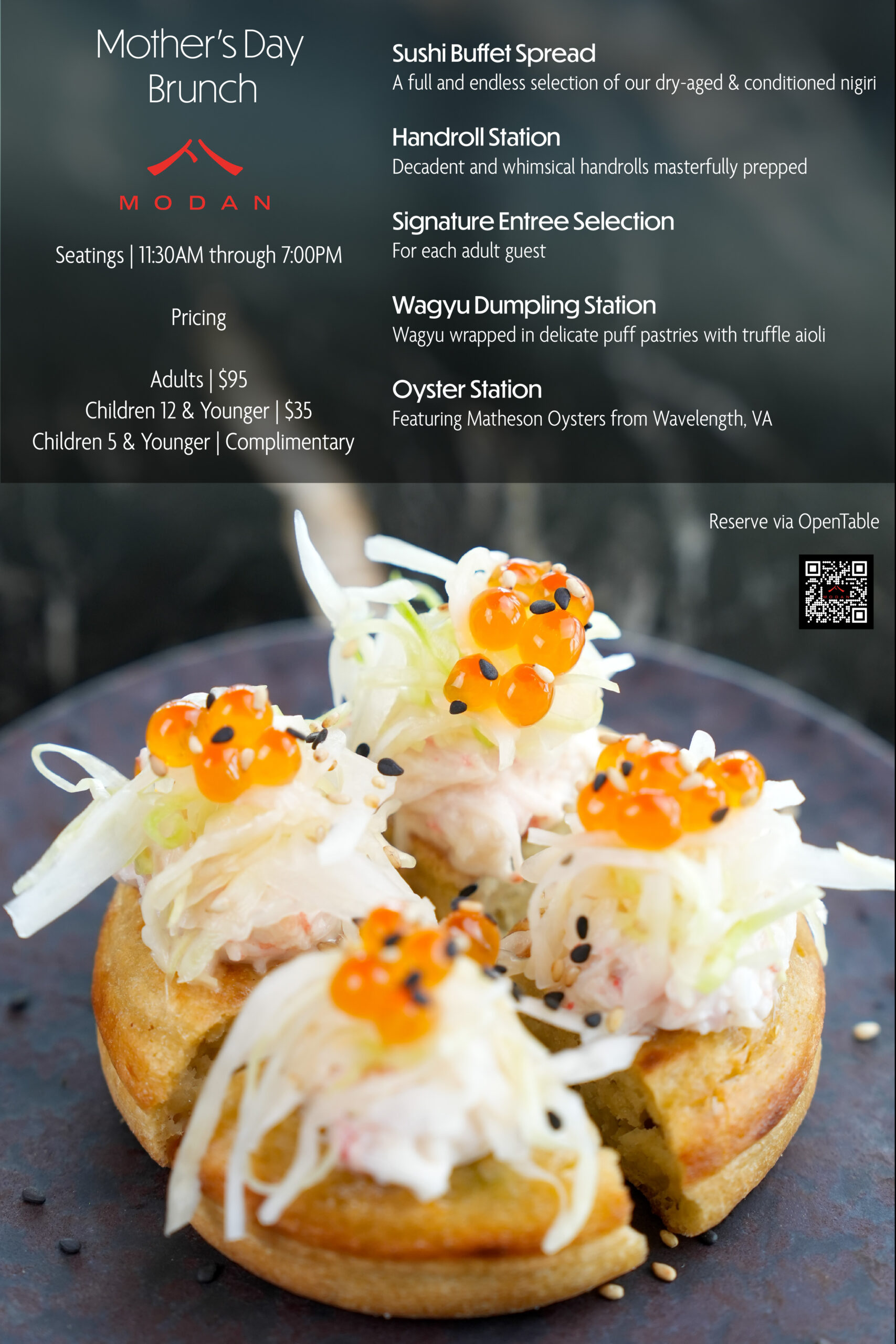 Modan will be converted to a unique open experience, with various featured food stations that will be serving our Wagyu Dumplings, Handrails, Oyster Bar selection, and more.